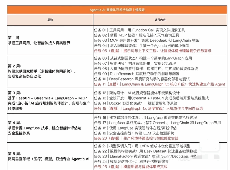 如何快速入场?我们精心打造了这门课,带你在真实项目闭环中,完成从传统开发到 AI 应用工程师的能力跃迁。通过 5 周实战行动营,基于 DeepSeek、GPT 等最新大模型,采用 MCP、LangGraph、Langfuse、LlamaFactory 等前沿技术栈完成六大实战项目,让你掌握企业级 Agentic AI 智能体开发的全链路技能。