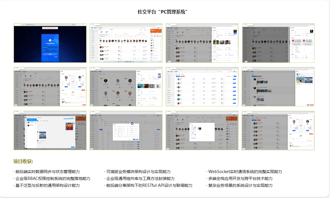 围绕“通用权限管理系统 + 即时聊天模块 + 社交交友平台”三大核心项目展开,手把手带你从 0 到 1 搭建 PC 前端、PC 后端、移动端的多端一体的完整应用交付。高效掌握TypeScript/Vue3前端+ Go后端技术栈,从账号、角色、权限等通用后台能力切入,逐步扩展至即时通信与社交业务场景。系统掌握接口设计、前后端联调、组件封装、WebSocket 实时通信及生产环境部署等全流程技能,真正具备独立交付可上线全栈应用的能力。