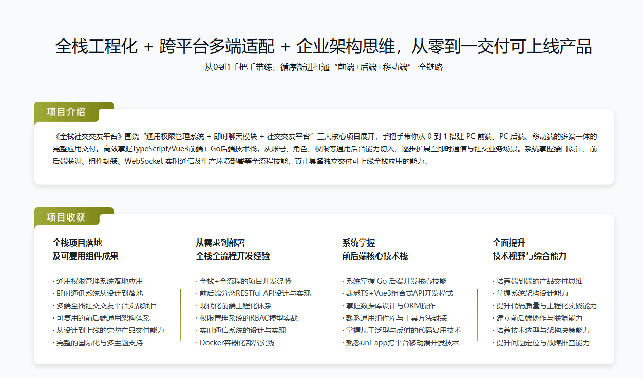 围绕“通用权限管理系统 + 即时聊天模块 + 社交交友平台”三大核心项目展开,手把手带你从 0 到 1 搭建 PC 前端、PC 后端、移动端的多端一体的完整应用交付。高效掌握TypeScript/Vue3前端+ Go后端技术栈,从账号、角色、权限等通用后台能力切入,逐步扩展至即时通信与社交业务场景。系统掌握接口设计、前后端联调、组件封装、WebSocket 实时通信及生产环境部署等全流程技能,真正具备独立交付可上线全栈应用的能力。