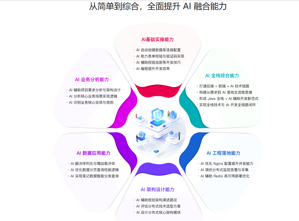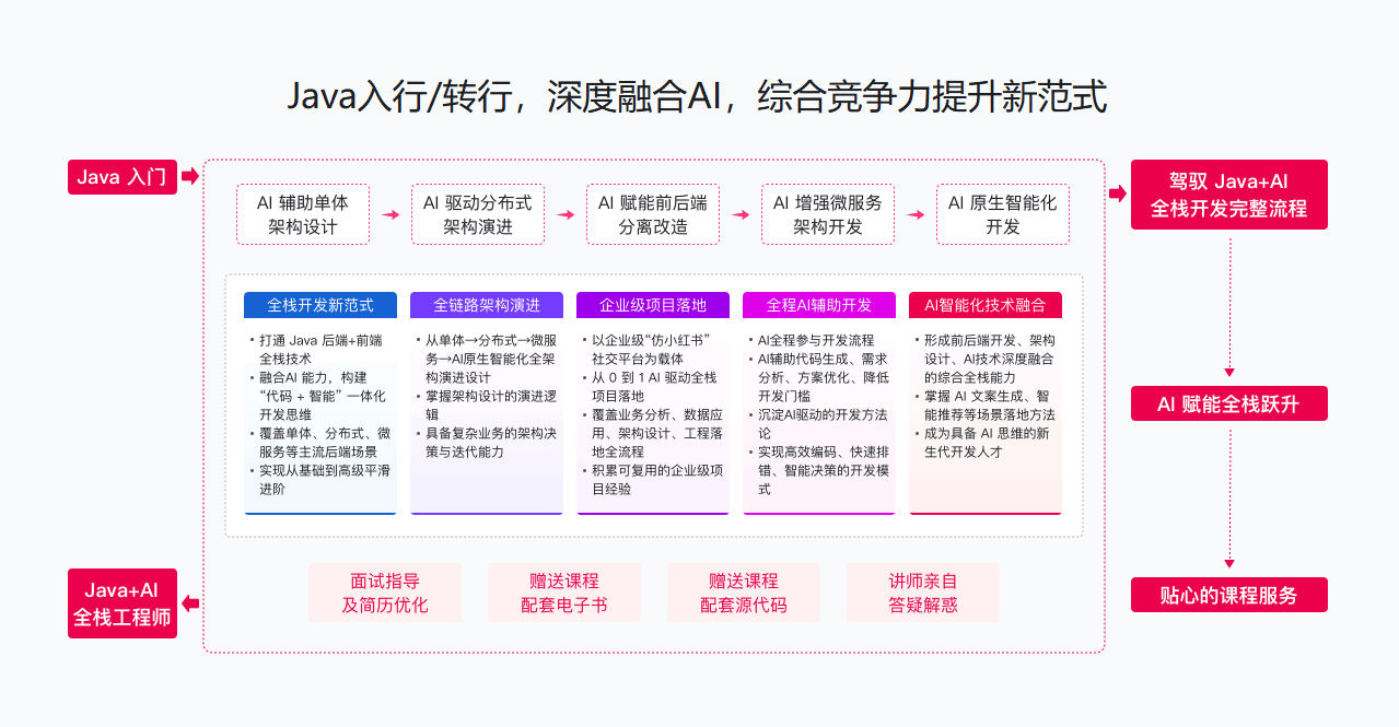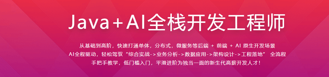 Java+AI全栈开发工程师视频教程。本课程打通“单体→分布式→微服务”架构演进路径,全面覆盖后端、前端及AI原生开发场景。以AI全程驱动,带你轻松驾驭“综合实战→业务分析→数据应用→架构设计→工程落地”全流程。手把手教学,低门槛入门,助你平滑进阶为独当一面的新生代高薪开发人才!